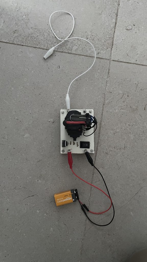 I first had to design the entire thing on tinkercad to then print it. When I first prototyped it I used a 1.5v battery but it was powerful enough so I ended up using a 9v one. Also, the way I designed it was in 3 different parts, the tip, the transformer part, and the battery holder.